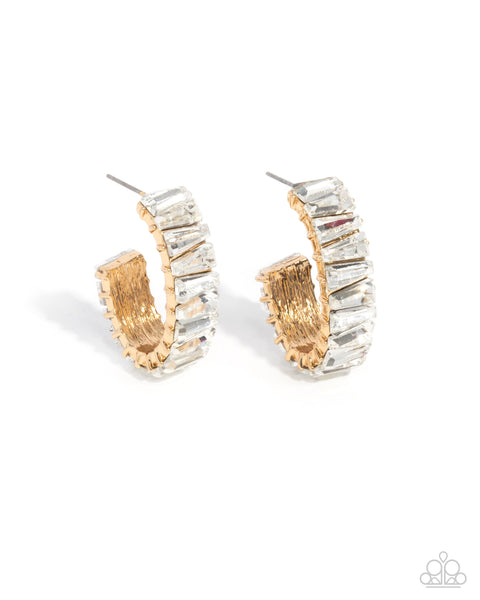 Pronged in thick, elevated gold fittings, a collection of chiseled emerald-cut white gems curls around the ear for a light-catching, luminescent look. Earring attaches to a standard post fitting. Hoop measures approximately 1" in diameter.