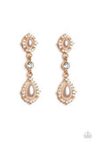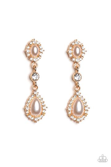 A solitaire white rhinestone is linked between two pearly and white rhinestone encrusted frames, creating an elegant lure. Earring attaches to a standard post fitting.