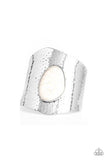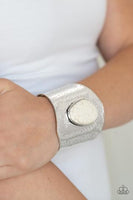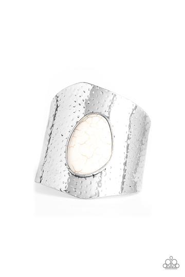 Delicately hammered in shimmery silver detail, a thick asymmetrical cuff wraps around the wrist. Chiseled into an abstract shape, a refreshing white stone is pressed into the center of the cuff for an artisan flair.