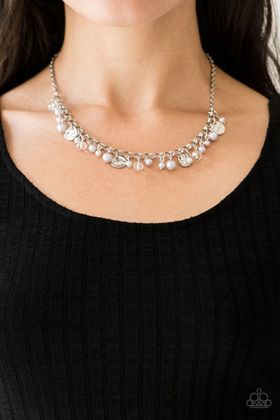 Pearly silver beads, smoky crystal-like gems, and hammered silver discs swing from a bold silver chain, creating a refined fringe below the collar. Features an adjustable clasp closure.