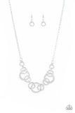 Varying in size, frames of flat silver hoops link below the collar for a dizzying look. Features an adjustable clasp closure.
