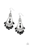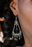 Faceted black teardrop beads swing from the top and bottom of ornate silver frames suspended by chains. Dainty white rhinestones are sprinkled across the silver teardrop filigree dcor for a whimsical finish. Earring attaches to a standard fishhook fitting.