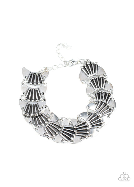 Featuring rustically studded and linear textures, silver crescent frames delicately link around the wrist for an artisan inspired look. Features an adjustable clasp closure.