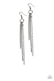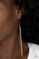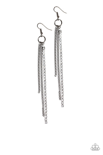 Featuring shiny gunmetal fittings, a strand of glassy white rhinestones join strands of mismatched gunmetal chains, creating a sleek chandelier. Earring attaches to a fishhook fitting.