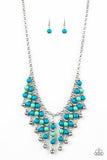 A collection of blue, green, and silver beads are threaded along metallic rods as they swing from the bottom of a shimmery silver chain, creating a flirtatious fringe below the collar. Features an adjustable clasp closure.