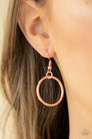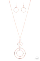 A series of shiny rose gold hoops are threaded through shiny rose gold fittings that connect into a dizzyingly stacked pendant at the end of a lengthened rose gold chain. Features an adjustable clasp closure.