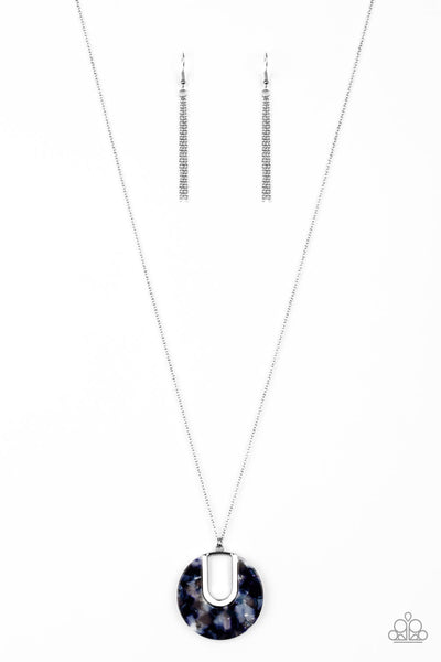 Flecked in shimmer, a faux marble blue acrylic piece is pressed into a shimmery silver frame, creating a retro pendant at the bottom of a lengthened silver chain. Features an adjustable clasp closure.