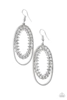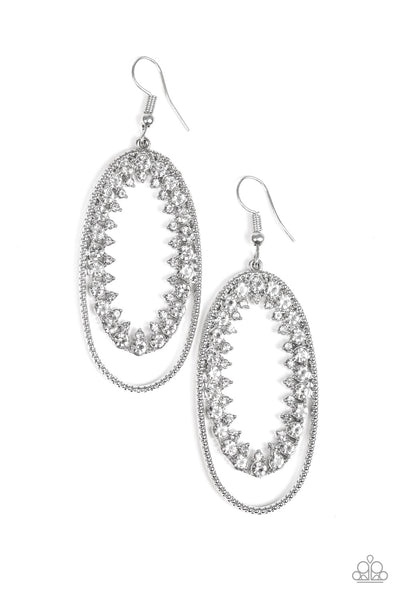 Ringed in a studded silver frame, glittery white rhinestones collect into a glittery lure for a refined flair. Earring attaches to a standard fishhook fitting.